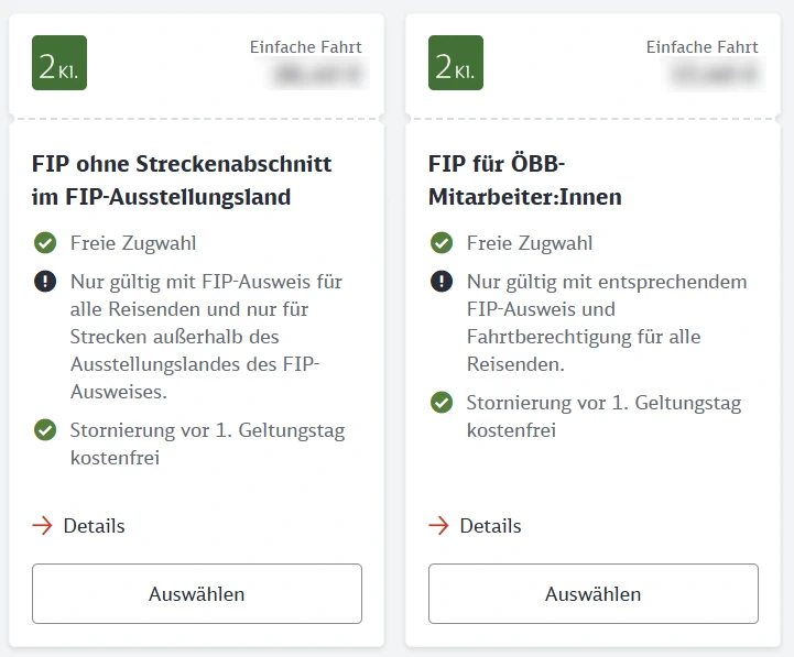 Employees of ÖBB, SBB, and PKP can also book tickets that are only valid for the German section of the route. For the section within their own country, an additional ticket is required, as the ticket price is calculated starting from the German border. The ticket is not valid in the country where the FIP Card was issued.